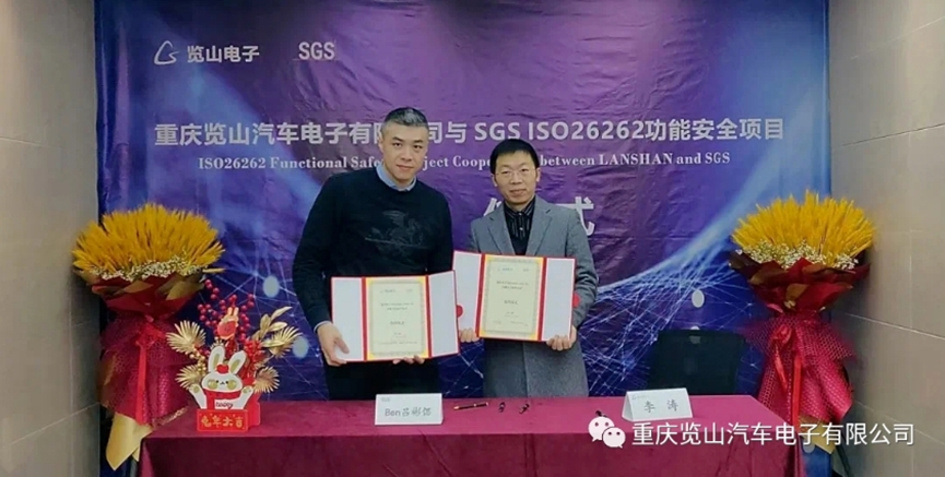 Recently, the strategic cooperation signing ceremony between Chongqing Lanshan Automotive Electronics Co., Ltd. (hereinafter referred to as "Lanshan Automotive Electronics") and SGS ISO 26262 Automotive Functional Safety Certification Project was successfully held in Chengdu. Li Tao, CEO of Lanshan Automotive Electronics, Fang Da, Deputy Director of R&D at Lanshan Automotive Electronics, Yang Li, Deputy Director of R&D at Lanshan Automotive Electronics, Lv Binsi, Director of SGS China Automotive Services, and Bao Yan, Senior Manager of SGS Automotive Services South, attended the signing ceremony.